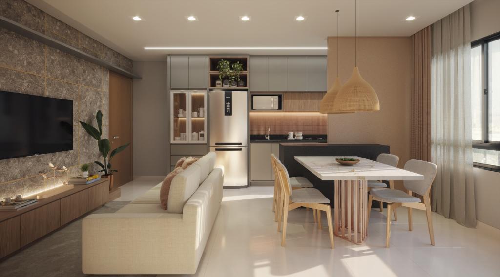 Residencial Link Clube House - Apartamento com 55,26 m², 2 Quartos sendo 01 suíte, sala de TV, sala de jantar, cozinha, área de serviço, banheiro social, varanda com churrasqueira à carvão.