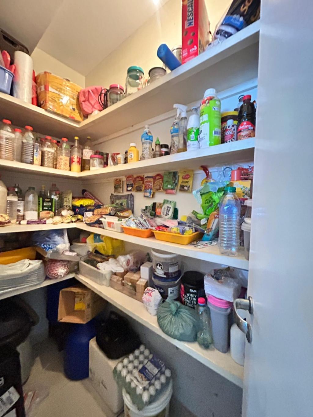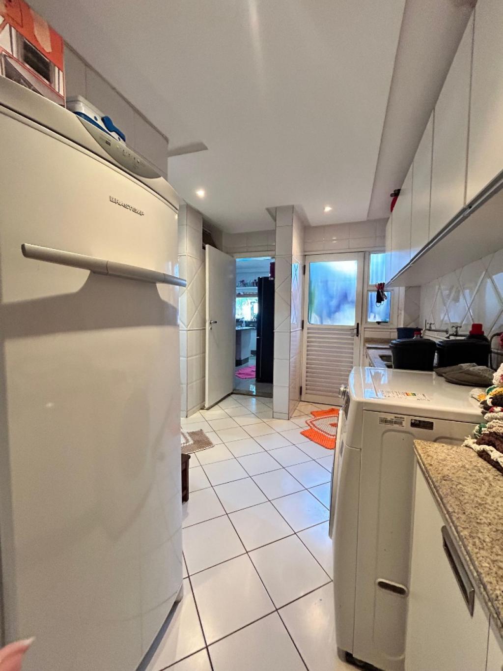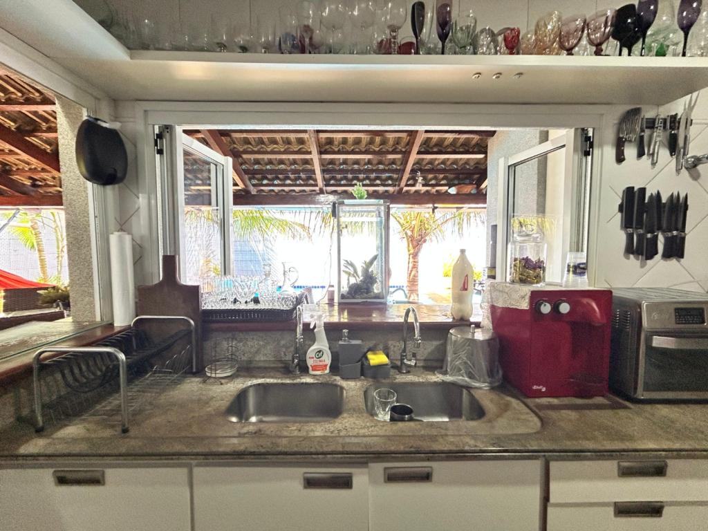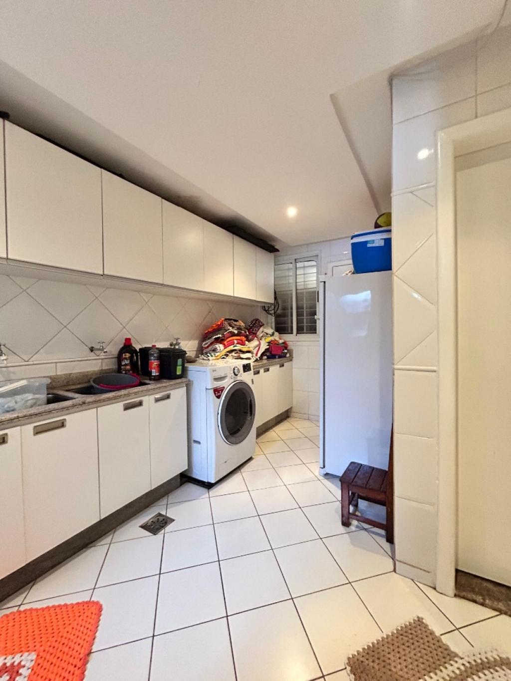 Cozinha com armários, pia com duas cubas fogão de ilha, DCE, área de serviço com dois tanques e armários.