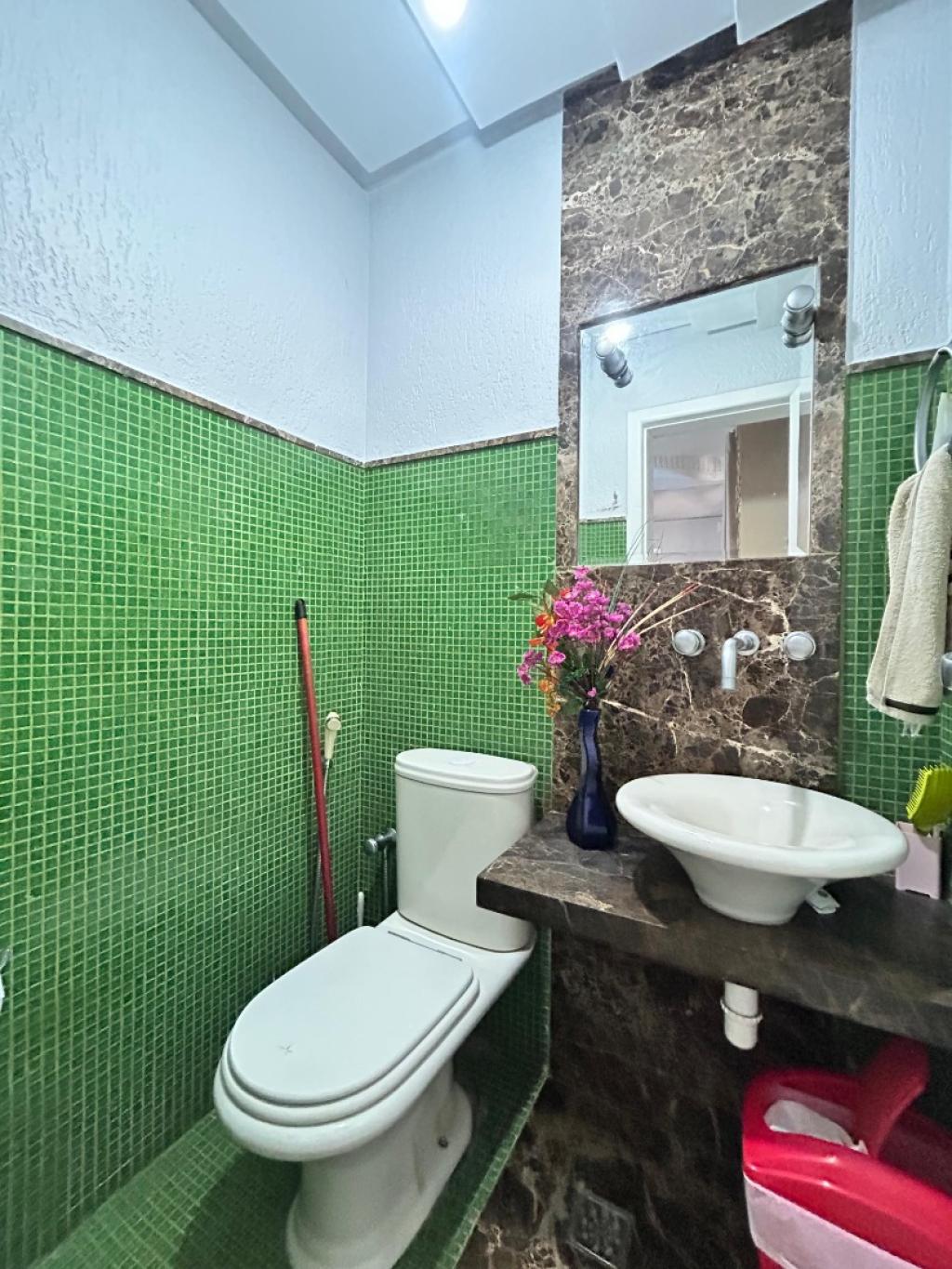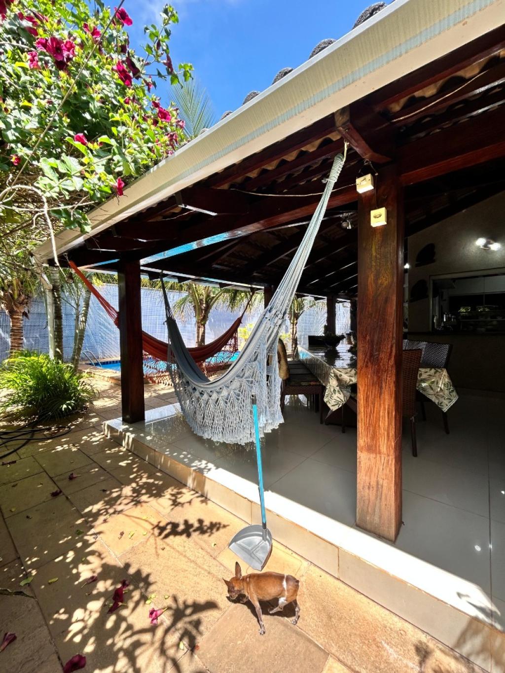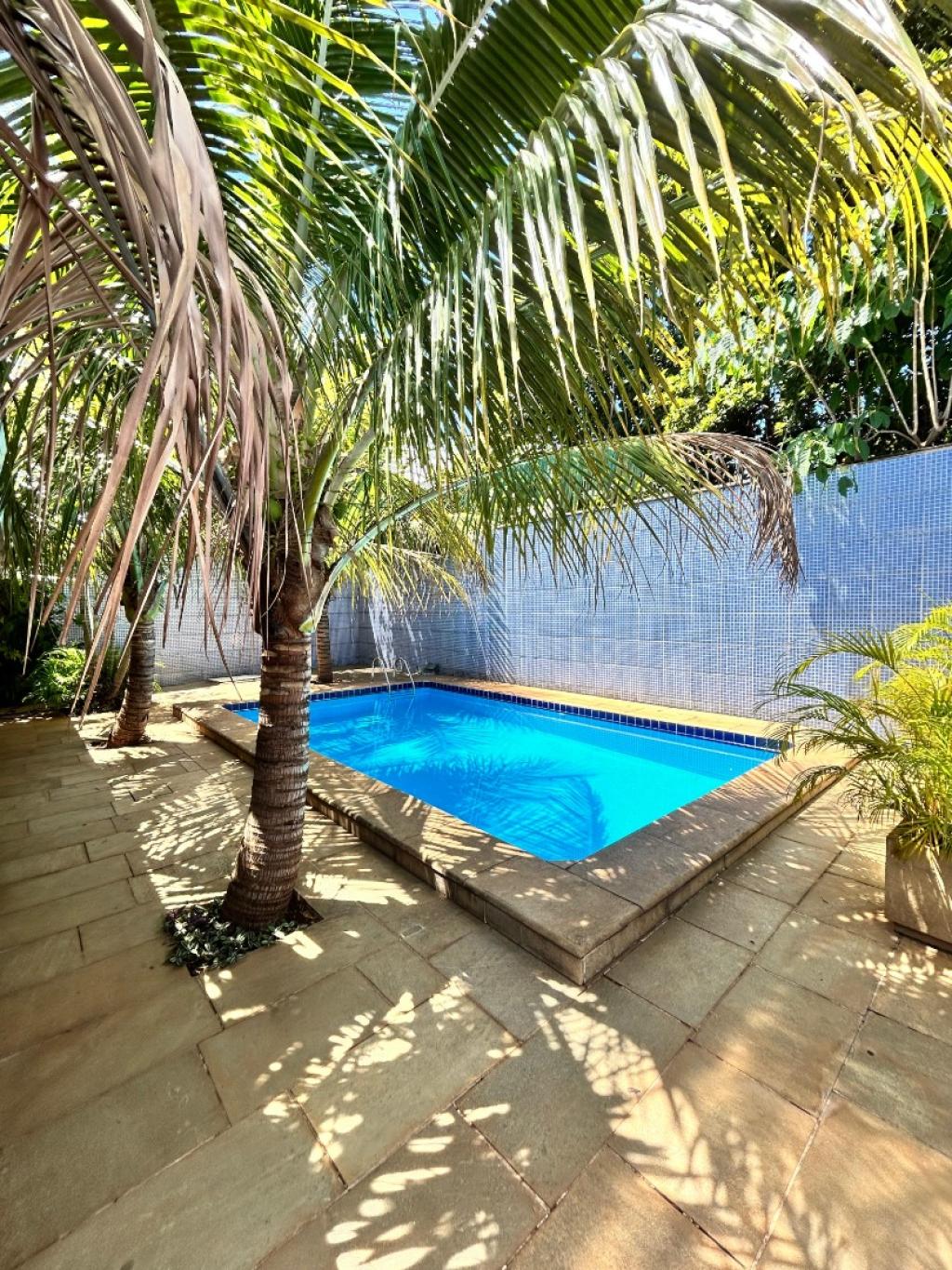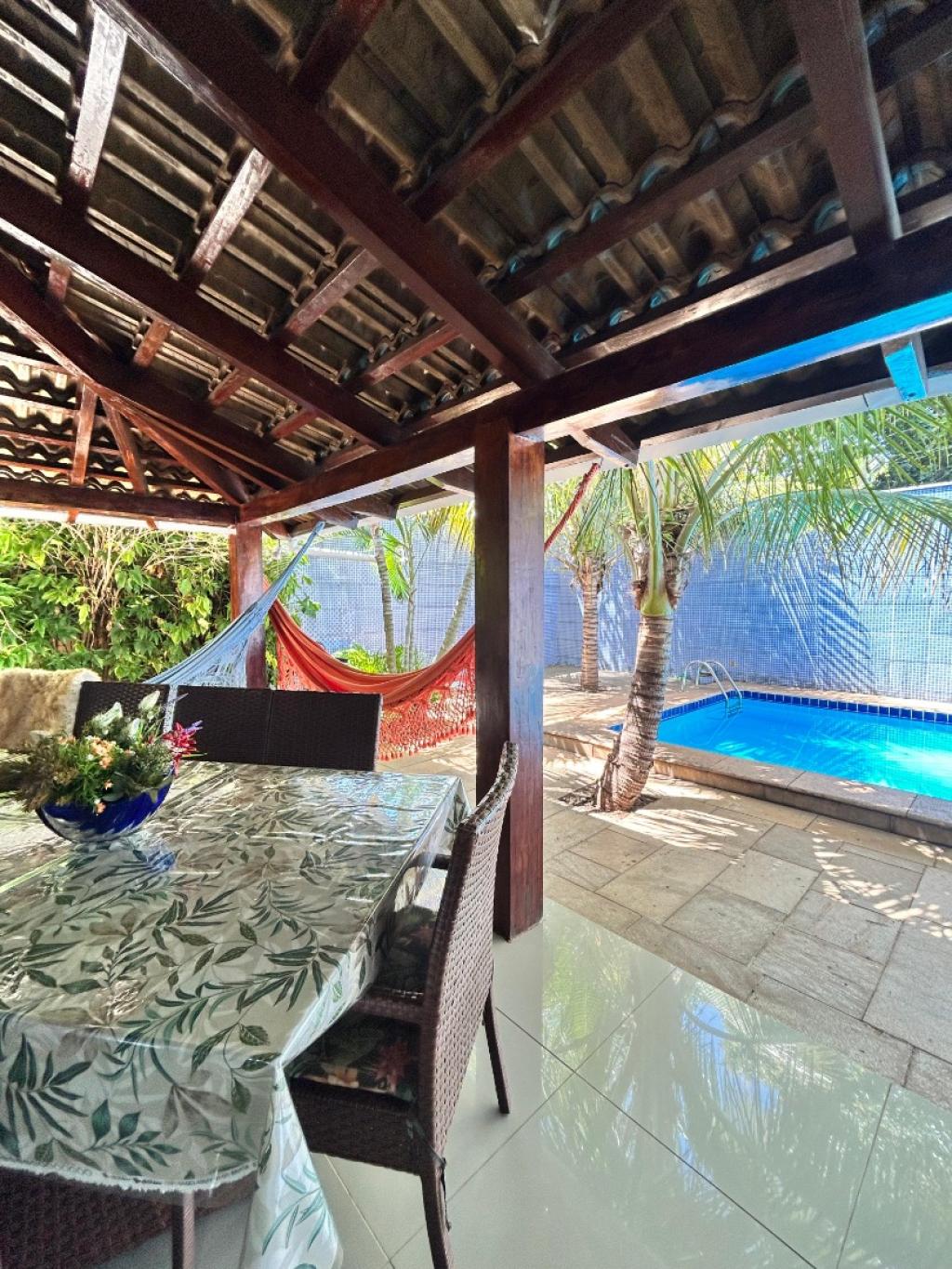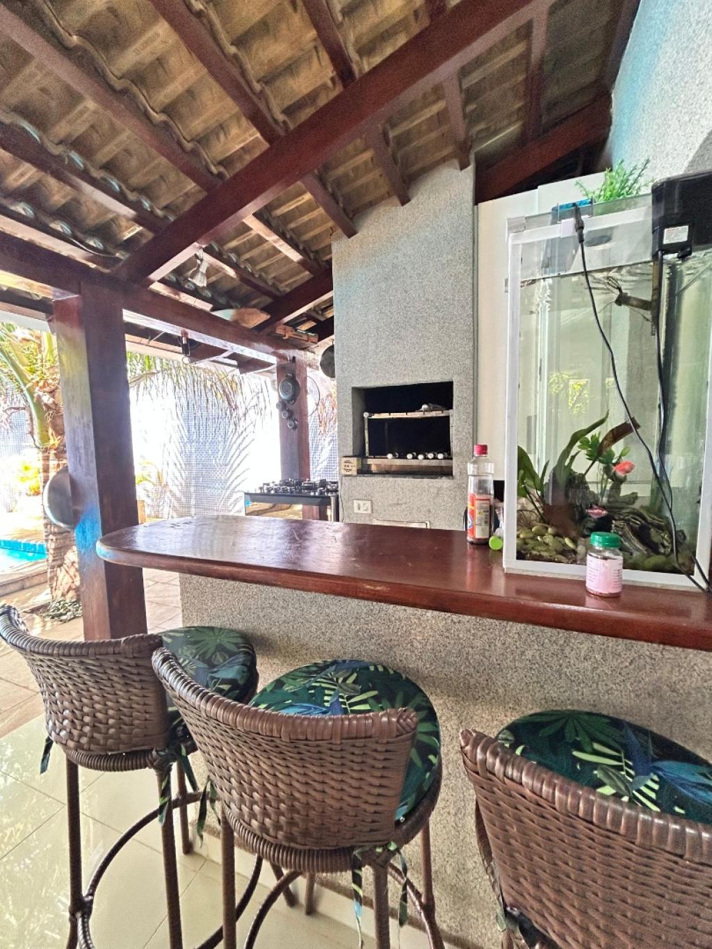 Área externa com piscina churrasqueira fogão e banheiro social.